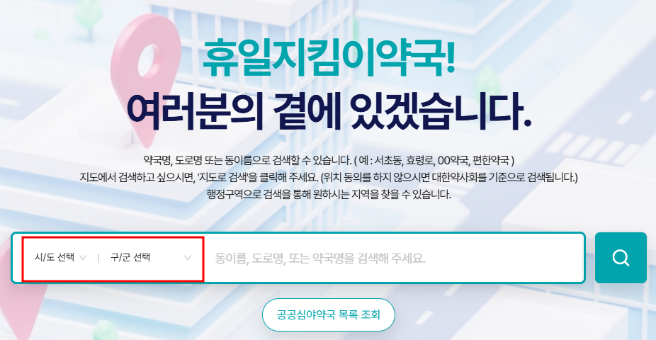 - 사용 방법: 사이트 접속 → 지역 선택(충북 진천군 덕산읍) → 현재 운영 중 약국 필터 적용