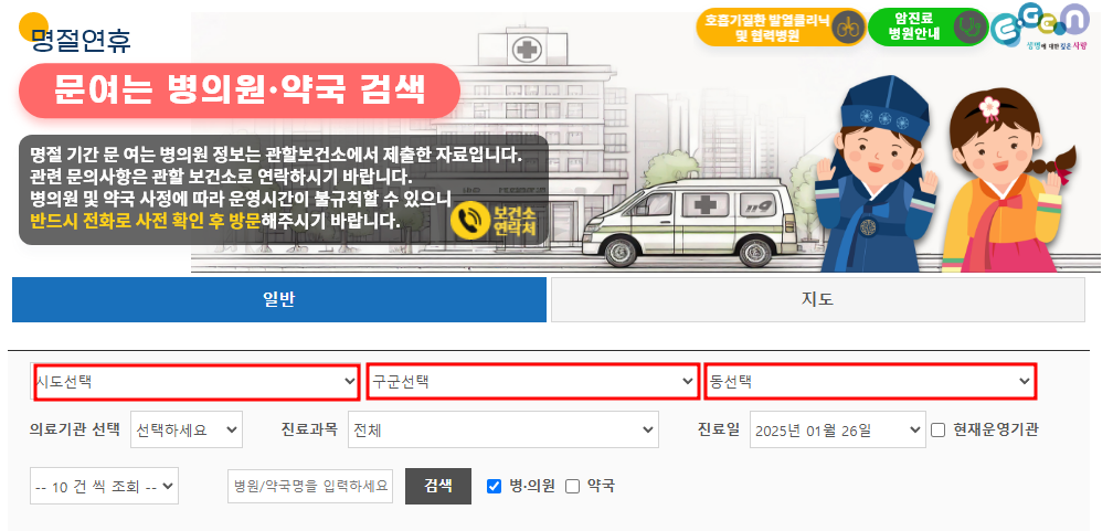 - 예: 진천제일중앙병원 응급실(진천읍), 정문약국